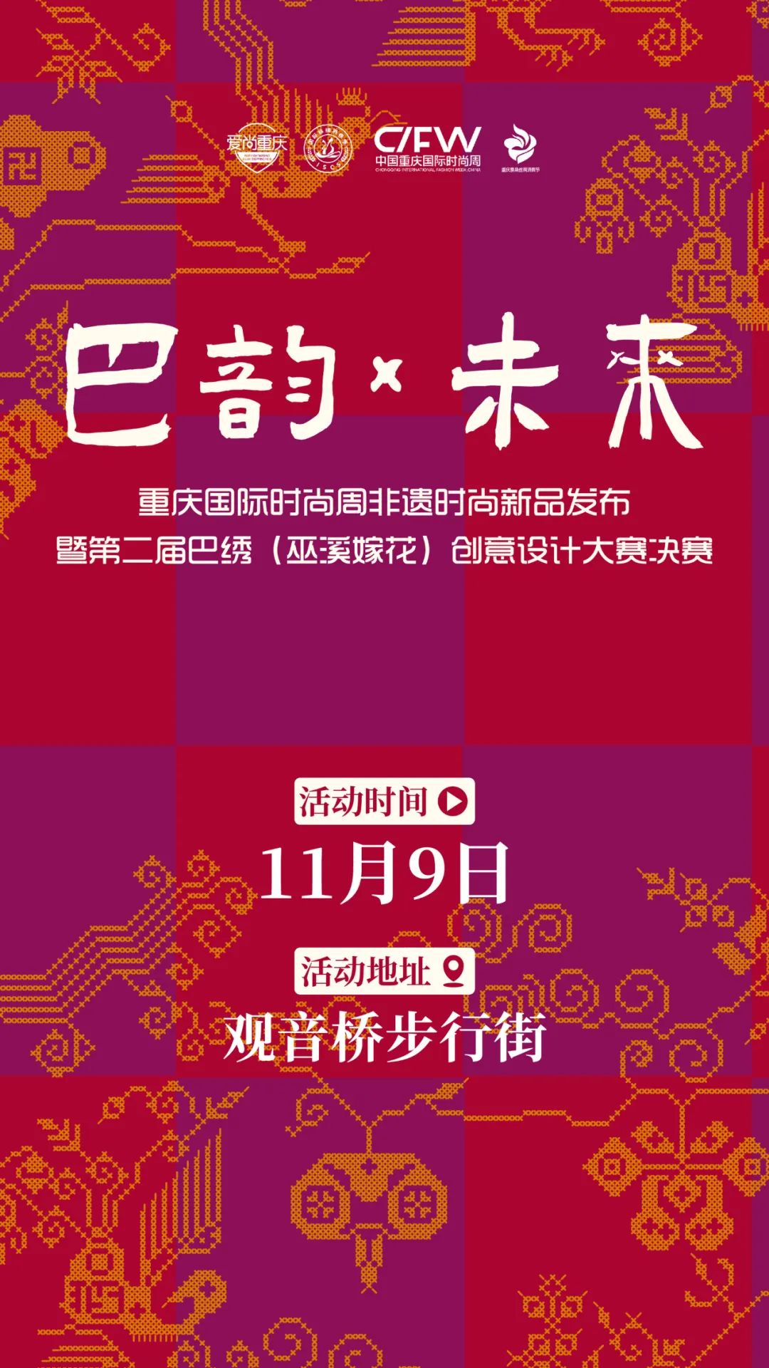 On November 9th at 19:30, the Chongqing International Fashion Week Intangible Cultural Heritage Fashion Show and the 2nd Baxiu (Wuxi Wedding Embroidery) Creative Design Competition Finals will be held at Guanyinqiao Pedestrian Street in Chongqing!